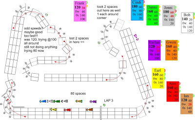 In order to test the track I build 10 cars based on whatever my current rule set it and run through a race with them on the track. I try to create three kinds of cars based on three common strategy types: bid-high-race-from-the-front cars, bid-low-race-from-the-back cars, and some form of run-from-the-middle cars. I do this right on the computer file -- moving car images around the track with blocks of car stats floating around outside the track. If you have ever participated in my play-by-email races you have a general idea of what that looks like.