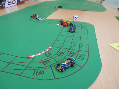 First turn went as hoped for me as I took the lead heading into turn 1. On that same turn 1 Will placed himself in the wrong spot -- outside when he could have taken the middle lane -- probably lost a space unable to take the line (I think he was thinking about a slip from Kevin that would never happen with the corner in front of them). Hint, that 1 space might become important later.